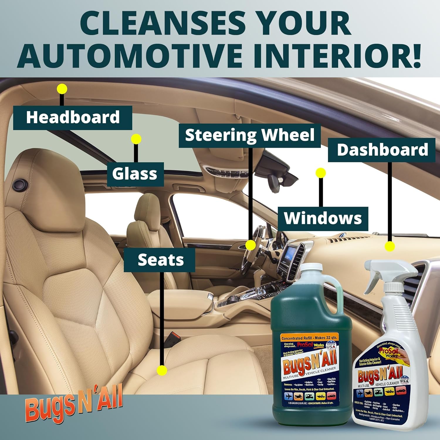 Bugs Nโ All Multipurpose Car Cleaner & Degreaser - Bug & Tar Remover Concentrate 1 Gallon - Exterior Cleaner Safe for Car Paint, Metal, Chrome, Aluminum, Windows & Mirrors - w/Free 32 oz Spray Bottle