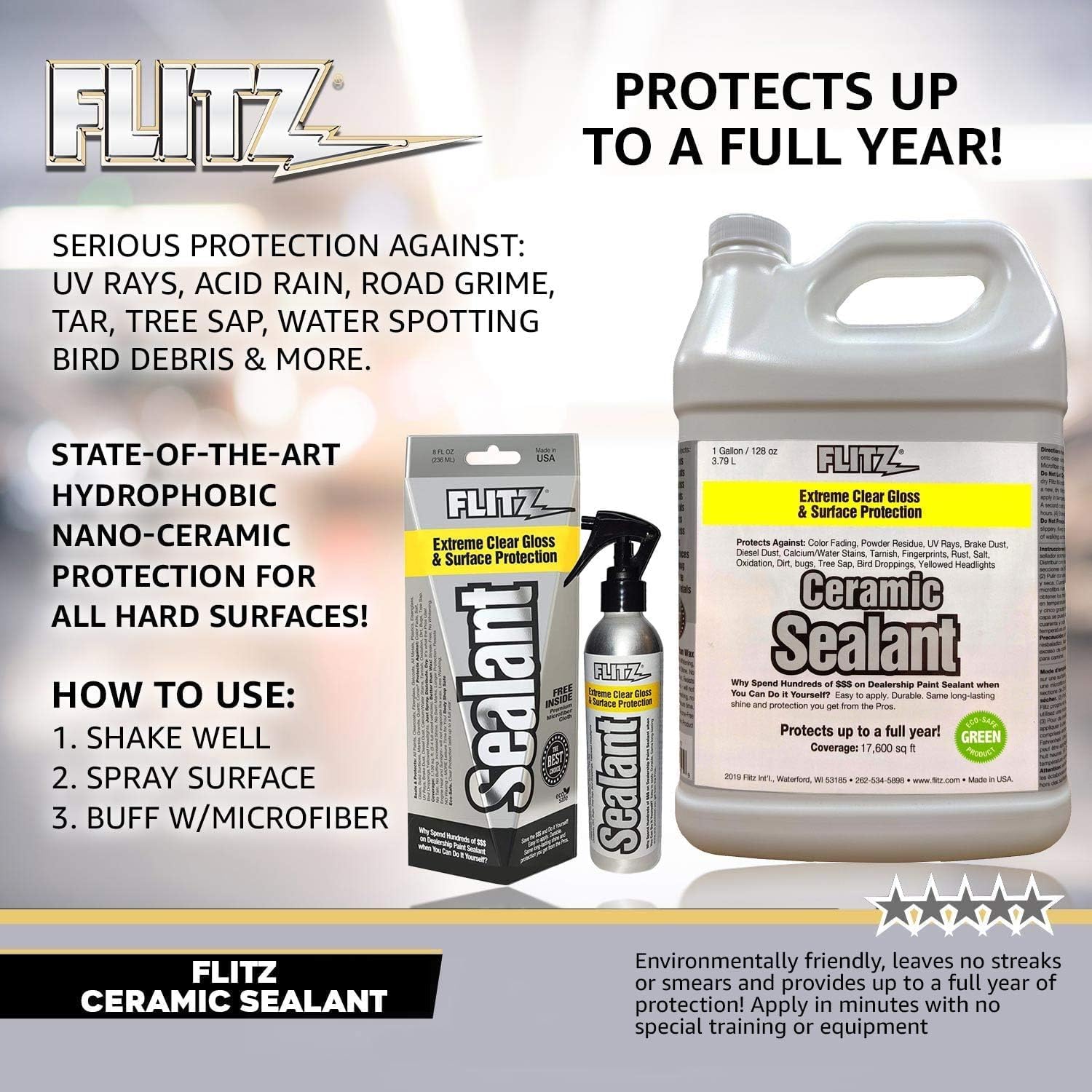 - PRO-GRADE CERAMIC SHIELD - Flitz Ceramic Coating Spray creates a durable barrier against water, dirt, UV rays, and every element in your path. Our ceramic glass coating's buff-off formula easily creates a shield thatβs ready for any adventure