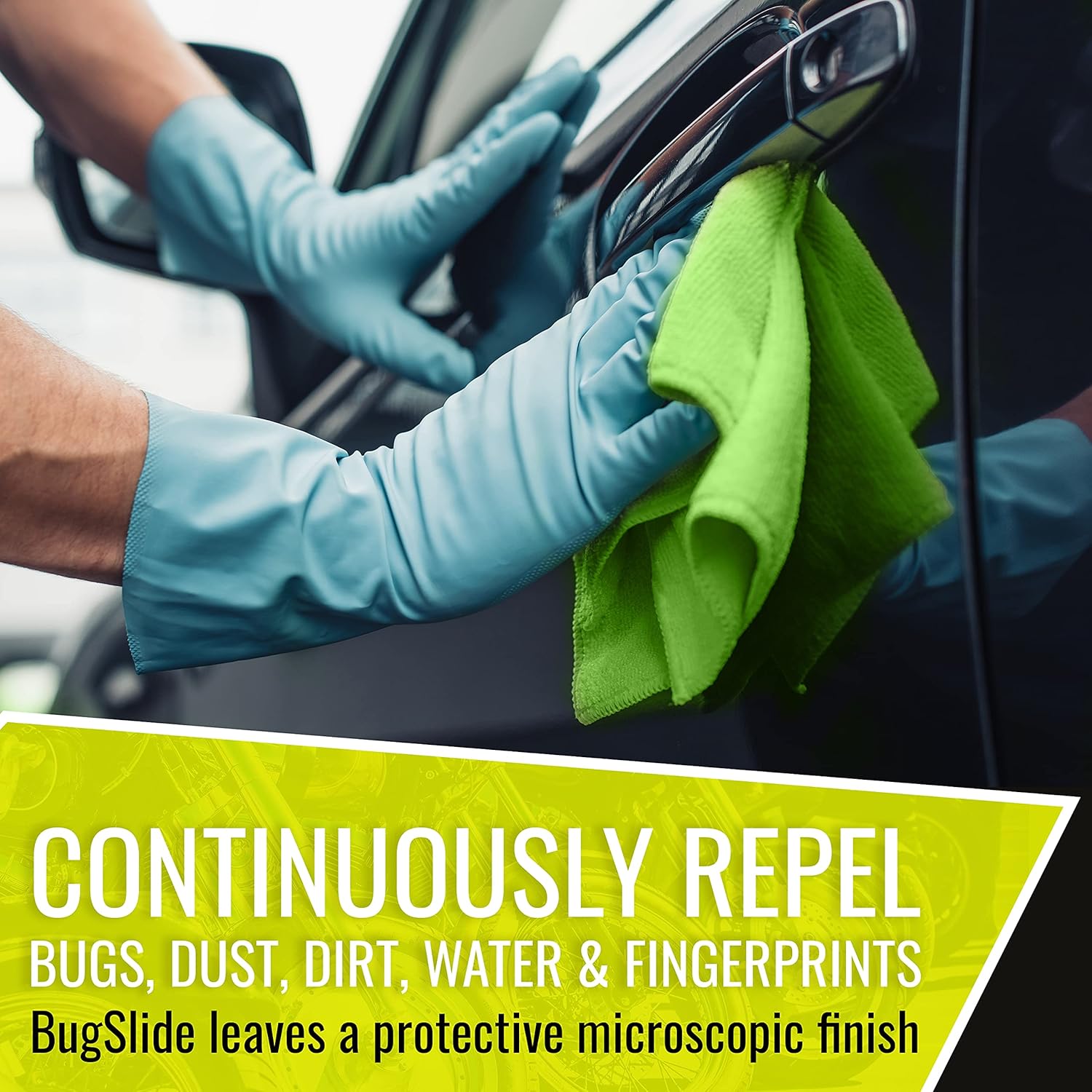 - Streak and Wax-Free β With BugSlide you will never need to wax your car again. Applied and paired best with a microfiber cloth towel to wipe clean, the release agent contains a UV filter for added protection and dries crystal clear with no yellow tint, film, build-up or powdery residue.