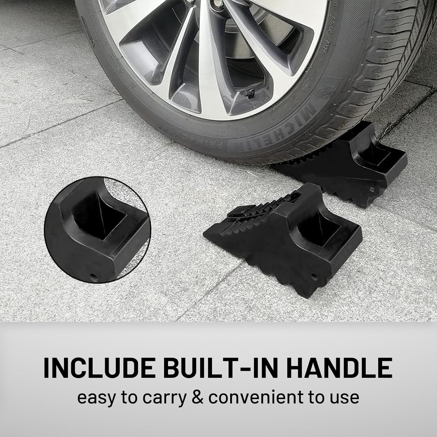 - Handles Design: Perfect built-in rubber handle for convenient carry and storage. These wheel chocks work best for vehicles, ATVs, trailers and RVs that weigh up to G.V.W. 8T.