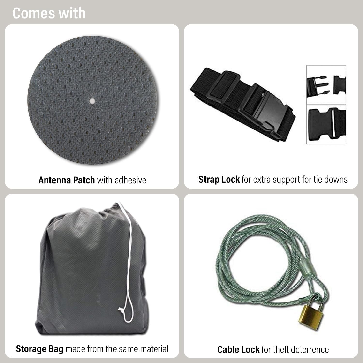 - COVER CAR WITH - With every purchase, this car cover comes with complimentary gifts, including an antenna reinforcement patch with adhesive, buckle strap locks to provide extra support for when you want to tie down, cable and lock for added security and theft deterrence, and a storage bag that is big enough to carry equipment and is made from the exact same material as the car cover so you can be sure that it is just as strong and durable as the car cover itself.