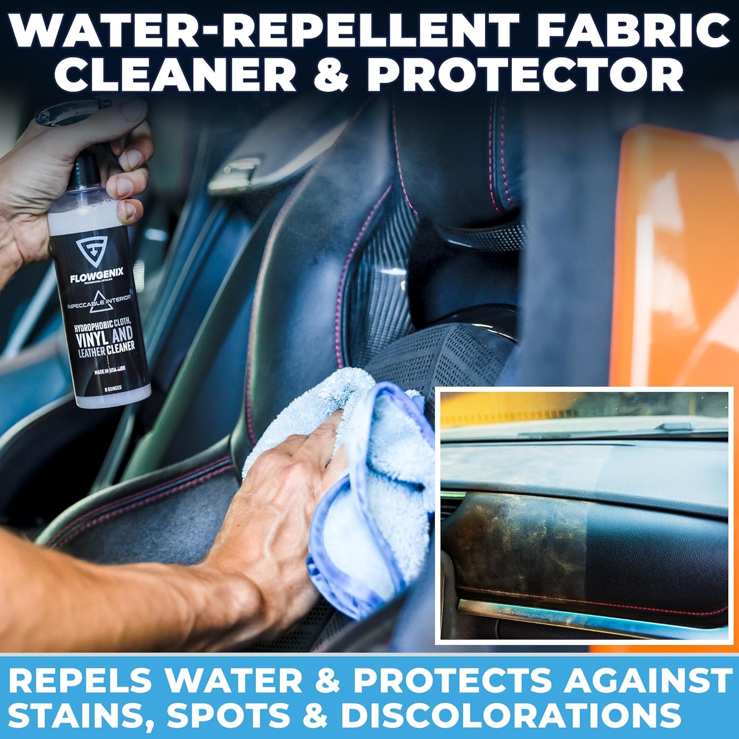 - โ WATER-REPELLENT VINYL & LEATHER CLEANER - IMPECCABLE INTERIOR: This water-repellent treatment adds a protective coating that will repel water, stains, and scratches. Designed for canvas, leather, suede, awnings, carpets, upholstery, nylon, and other similar textile. Impeccable Interior is transparent and breathable, preventing any color change on the material itโs applied upon (8oz bottle)