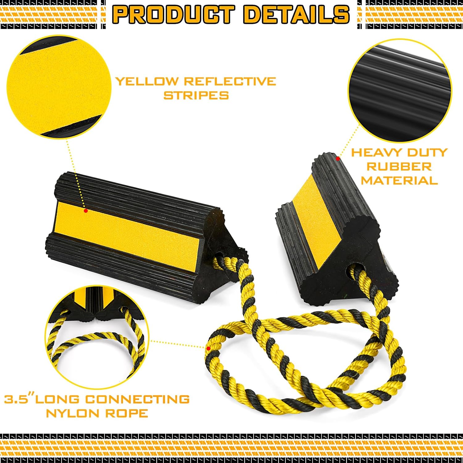 - Yellow Reflective Strips: each trailer wheel chocks has 3 reflective red stripes to ensure high visibility even in low light conditions, ideal for indoor or outdoor environments such as garages, warehouses and other commercial parking lots and other dark conditions. Essential for safe use at night or during adverse weather, enhancing security and visibility