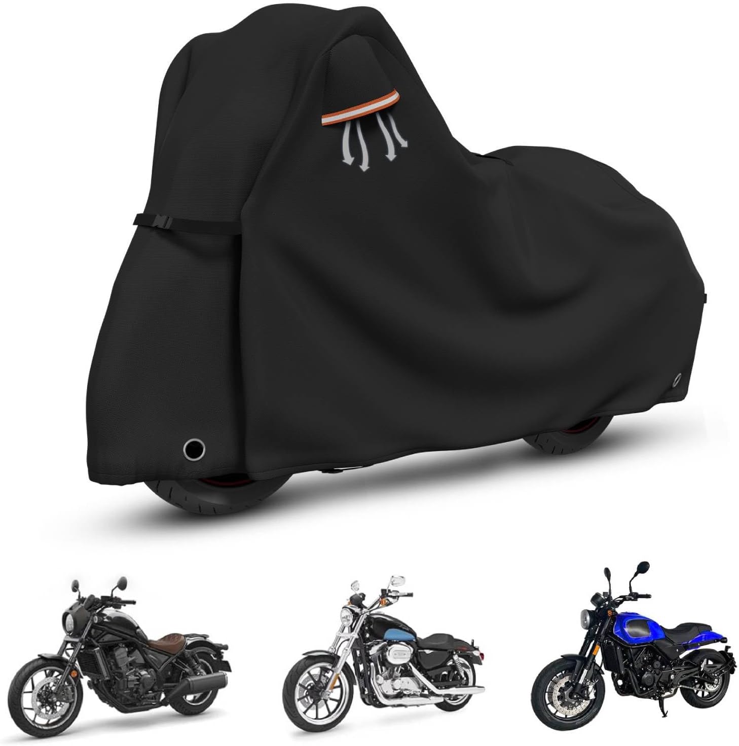 - ăUnique Designsă(1) Two air vents prevent moisture under the cover. (2) Waterproof Black PU Coating: UV protection and heat-proof,prevent cracking and aging of inner decoration leather and plastic. (3) Two full Orange Reflective Strips to prevent collisions during the night and depict the body of your motorcycle with a chic look. (4) Antenna openings with Velcro, 2 Anti-theft lock holes(No locks) and a stereo storage bag.