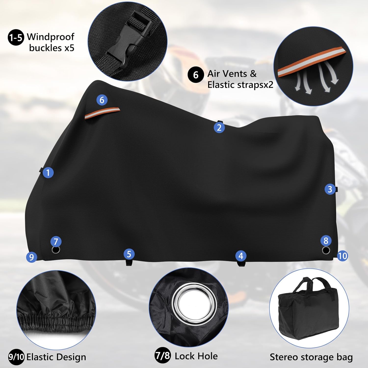 - ăWindproof and Waterproofă(1) Three windproof buckles under the cover are to make sure the cover stay in the place. (2) Front and rear Elastic hems on the bottom to keep the cover from being lifted by wind and for a snug and secure fit. In addition, One buckle on the cover is to adjust the tightness of the cover. (3) Double-stitched & Waterproof Strip make the motorcycle cover better waterproof, no water seepage.