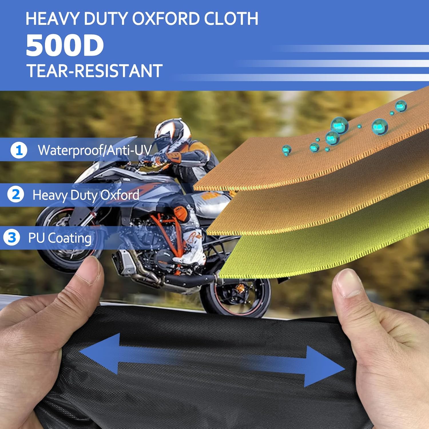 - ăGreater MaterialăThe motorcycle covers are made of premium 500D oxford cloth with PU coating, harley davidson motorcycle cover are durable and waterproof, no more worry about the sunlight, rain, snow, wind, dust, resin, leaves, debris and bird droppings.