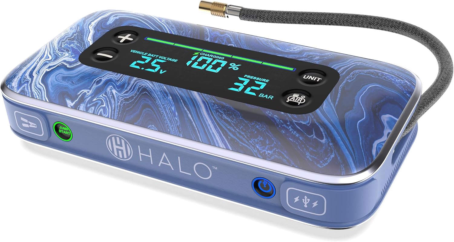 - HALO Bolt Air+ 1750: No more dead car batteries or flat tires. Jump start your vehicle, inflate your tires, and charge USB powered devices. It has an integrated floodlight, so you’re better prepared for roadside emergencies and power outages