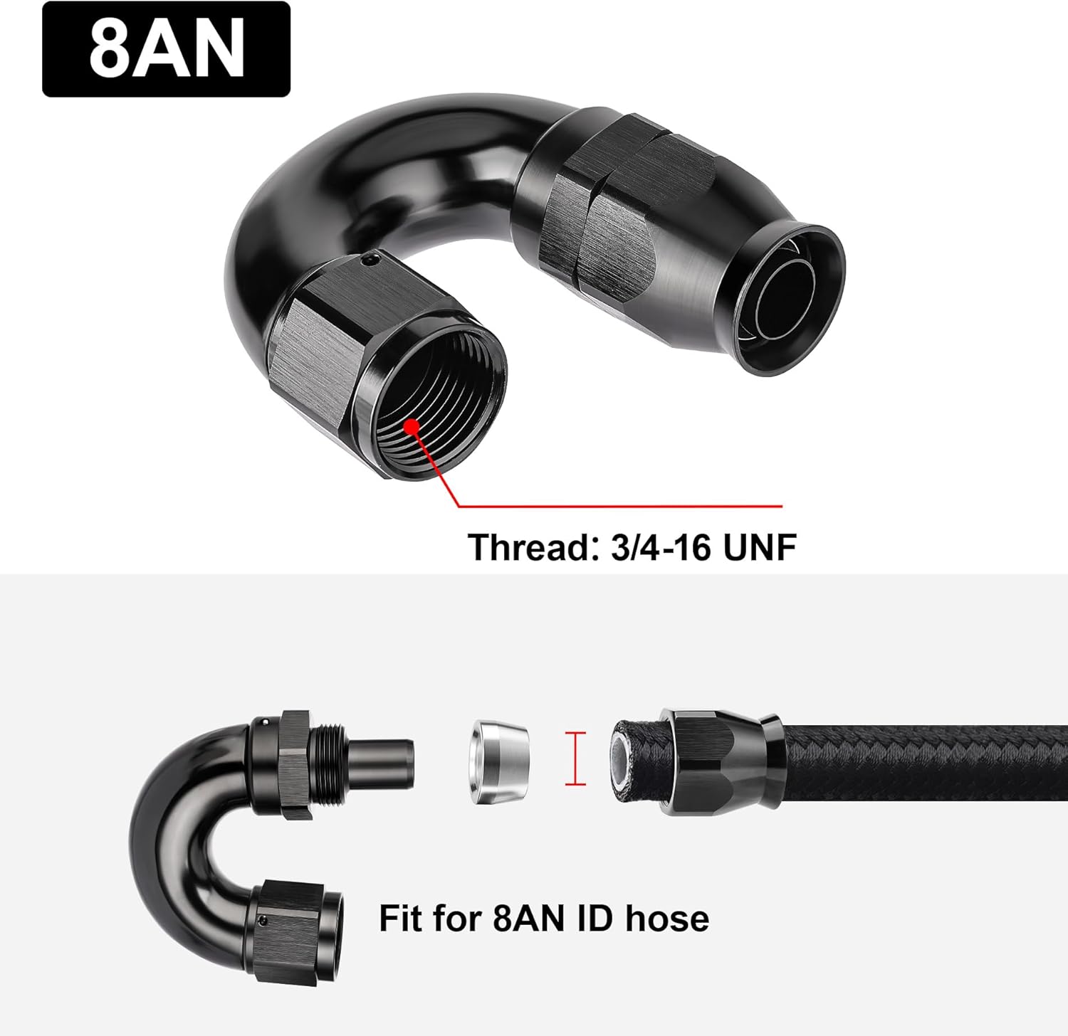 - [Product Size & Parameter] Size: 8AN. Thread Size: 3/4-16 UNF. Working Pressure: 1500PSI. Working Temperature Range: -40°F-250°F. Angle: 180 Degrees. Note: Please verify the hose size before purchase.