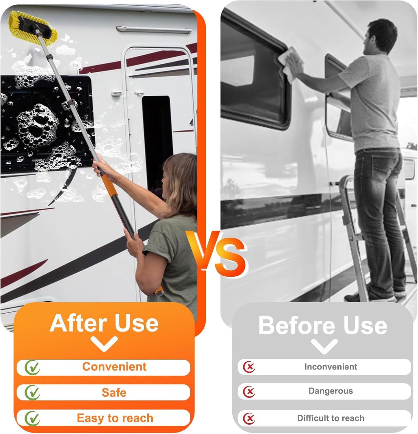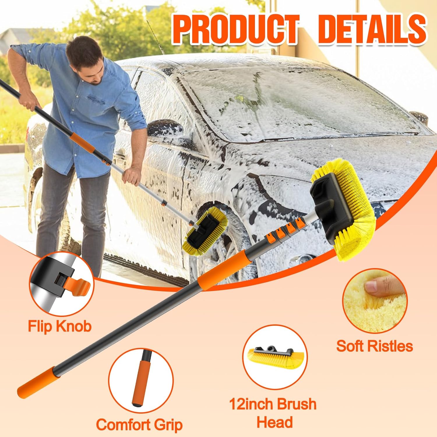 - Ultra-Long Telescoping Range for Easy Access to High Areas: The LAANPOLE car wash brush features a telescoping pole design that adjusts from 3FT to a maximum of 12FT. This allows you to reach higher areas with this car wash brush with long handle while standing up, eliminating the need for a ladder when cleaning the top of vehicles and other hard-to-reach areas. The design of the car brush makes high-area cleaning easy
