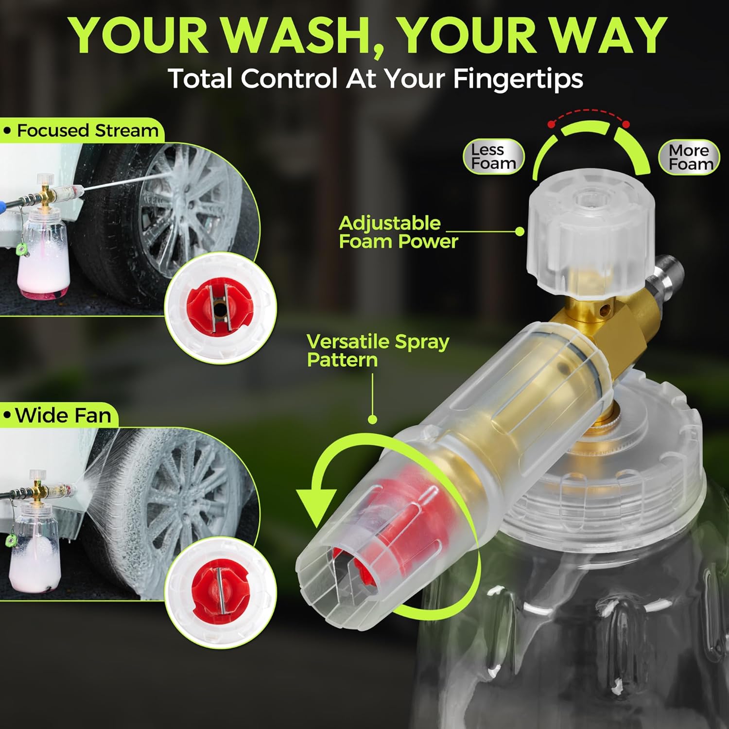 - ๐โจ ๐๐ถ๐ด๐ต-๐ฃ๐ฟ๐ฒ๐๐๐๐ฟ๐ฒ & ๐จ๐ป๐ถ๐๐ฒ๐ฟ๐๐ฎ๐น ๐๐ถ๐--REQUIRES pressure washer (Not Garden Hose). The 1/4" Quick Connector works with all major pressure washer brands, while the wide-mouth design makes refilling car soap a breeze. Leak-proof seals keep your workspace tidy, and the transparent bottle with measurement lines ensures perfect soap ratios โ whether you're using a car wash foam cannon for the first time or are a seasoned detailer.
