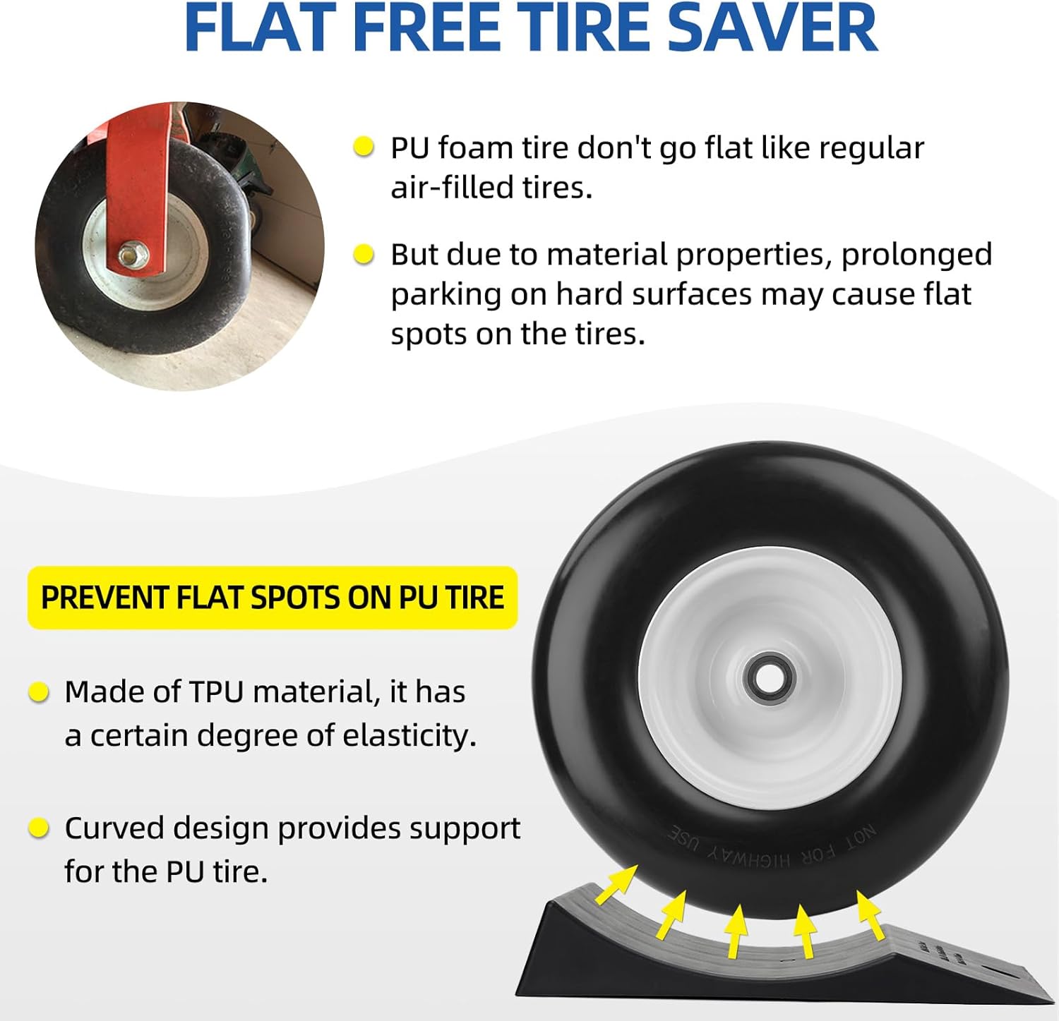 - Prevents Tire Flat-Spotting β The specially engineered curved surface fully matches the shape of 9-12 '' flat free tires, preventing the issue of flat spots on PU foam tires caused by prolonged parking on hard surfaces under high temperatures