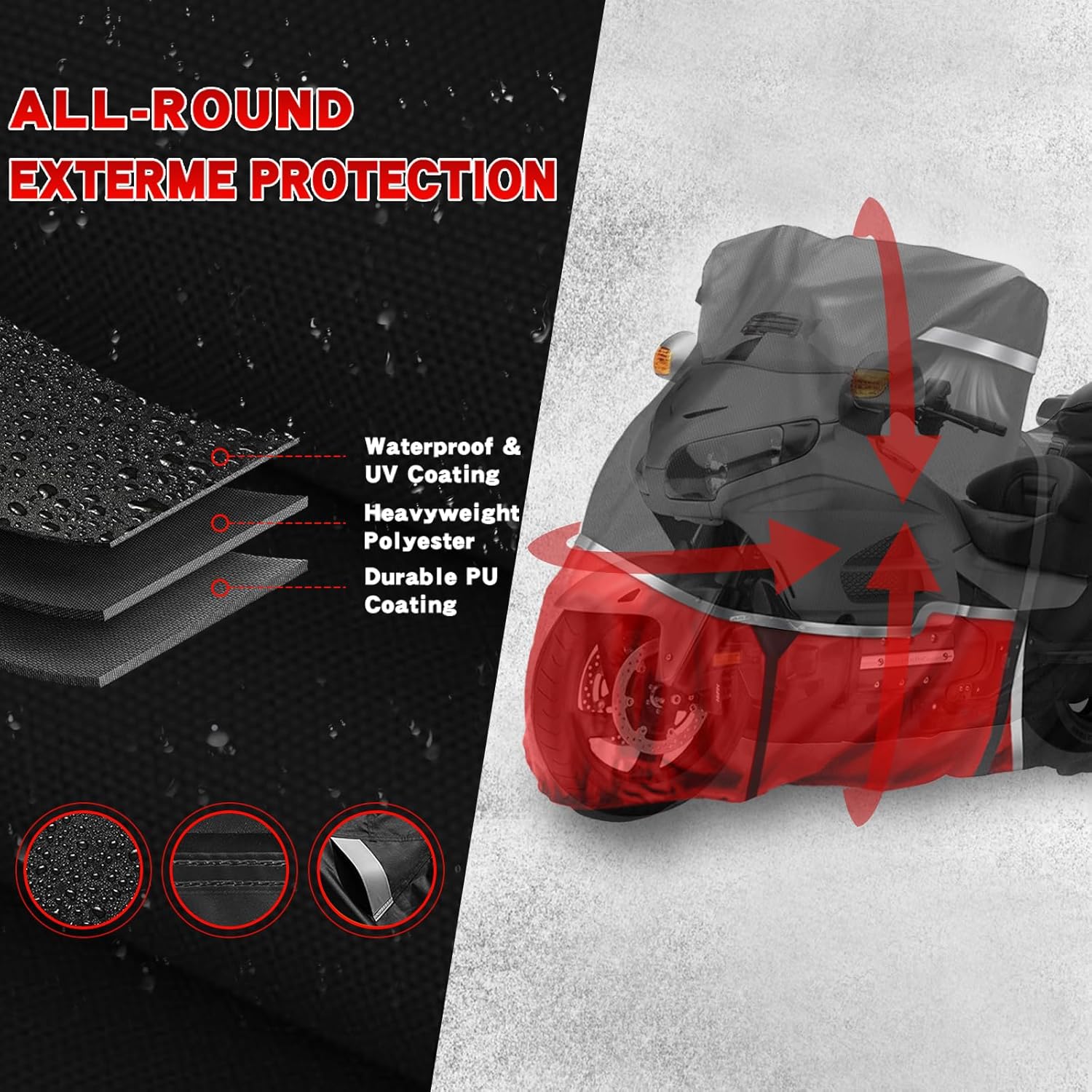 - Premium 420D Oxford Fabric with Triple Coating: Made from heavy-duty 420D Oxford fabric, this waterproof motorcycle cover features an inner nano-material triple coating for a smooth, scratch-free surface. Reinforced seams with waterproof strips and double stitching ensure superior protection against rain (up to 8000MM water pressure). Avoid sharp ornaments to prevent damage